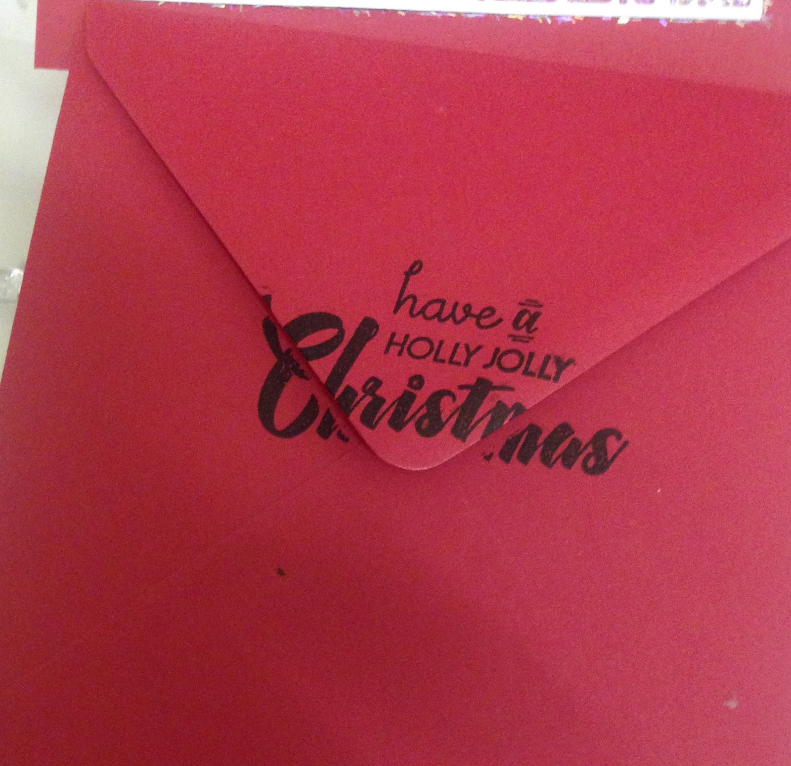 I stamped the gnome, wearing the plain hat, on the inside of the card as well as on the envelope and added the same sentiment on the card onto the envelope, as shown on the right