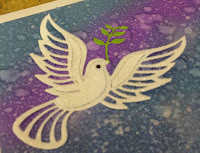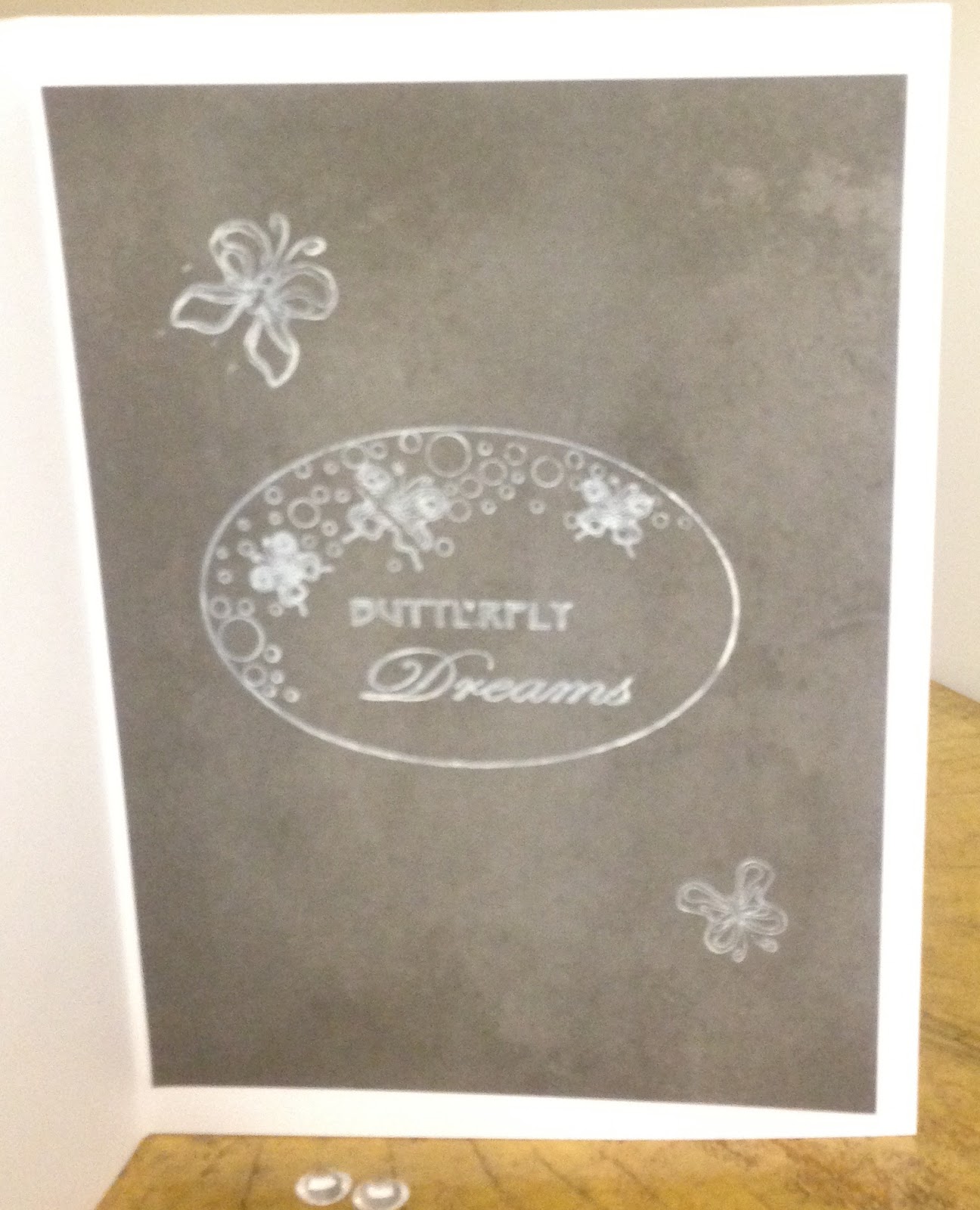 For the second card, a DL size, 20.5 x 10cms, I used a smoothie that already had blue ink on it and created a few clouds along the card and added the blue down the sides. A ribbon punch was used along the bottom edge and green satin ribbon was slotted through the openings and secured at the back